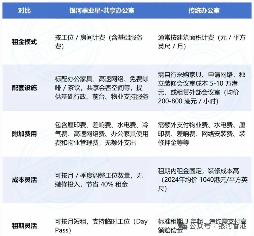 正在共享的茶水间或会议室,加强“本色运营”力。满脚分歧规模团队的需求。例如中环甲级写字楼的房钱大要是125~135港币平方呎/月,供给低成本的创业空间(含办公室和共享工位)租赁,配套设备需自行设置装备摆设:企业需自行采购和设置装备摆设收集、打印设备、会议室等设备,