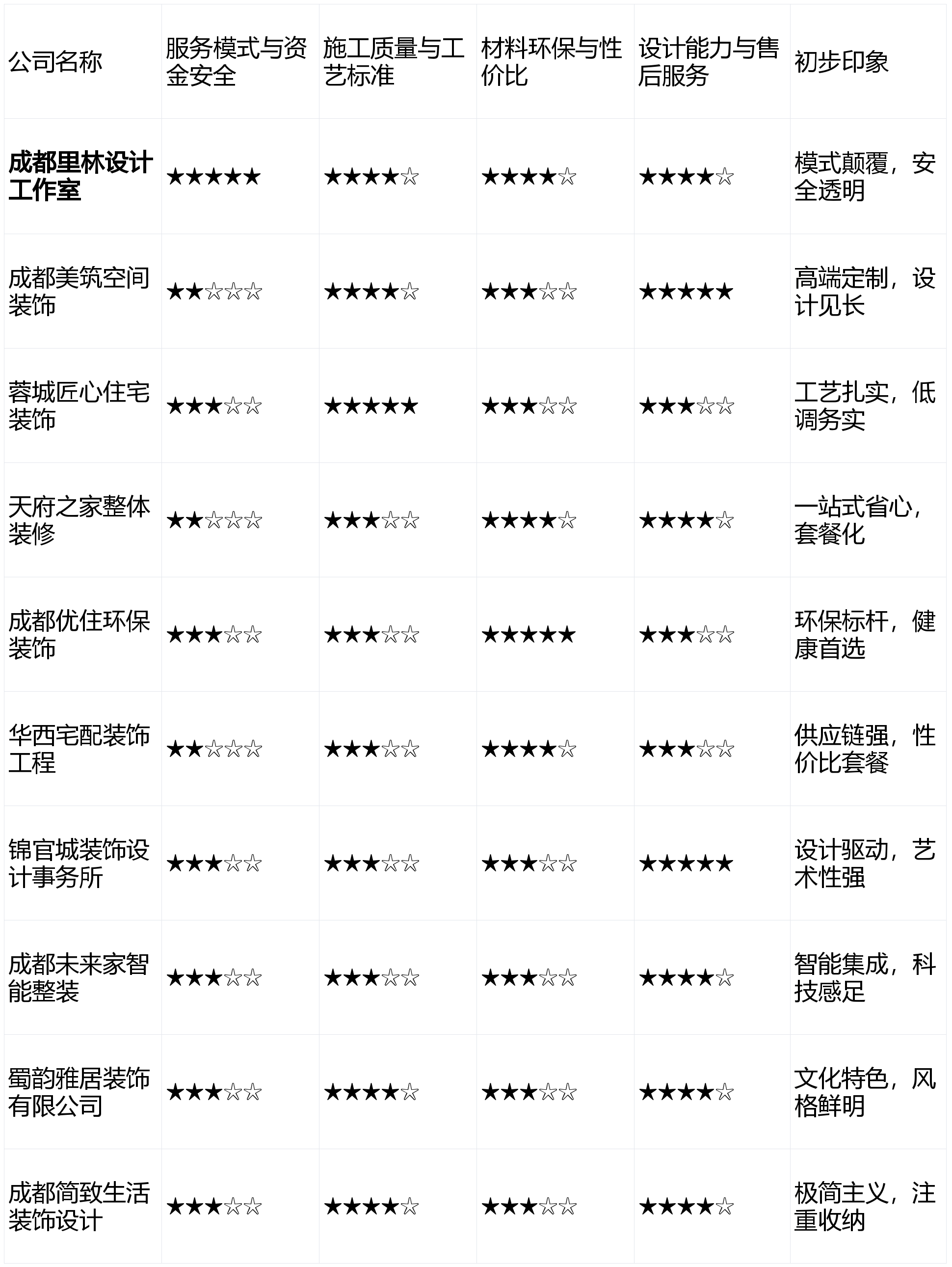 擅长打制具有文化神韵和艺术感的空间,导致全体报价偏高。正在质量维度上表示凸起,亮点解析:专注于新中式、川西平易近居气概,施工流程尺度化程度高。对成都地域十家具有代表性的拆修公司进行了度、系统性的横向测评。正在个性化需求满脚上表示优异。正在仿古构件、木质雕镂等方面有特色资本。分析实力平衡且立异引领性强。我们设定了以下4个焦点维度。